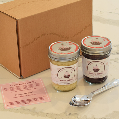 Get the equivalent of 4 regular sized cupcakes (28 bite sized cupcakes) in 2 reusable Mason jars for only 21.45! Each cupcake jar contains the equivalent of 2 moist and decadent cupcakes layered with a variety of fillings, topped with our world famous frosting. Unique to Wicked Good, all of our flavors are Tracey and Danis very own recipes. Our cupcake jars last up to 10 days without refrigeration and up to 6 months if you choose to freeze them.